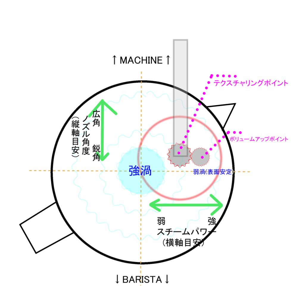 具体的に言うとスチームワンドがそのまままっすぐ伸びたらピッチャーの手前側(自分側)の底にくる位置が理論上スチームから底面まで一番長く距離が取れる。