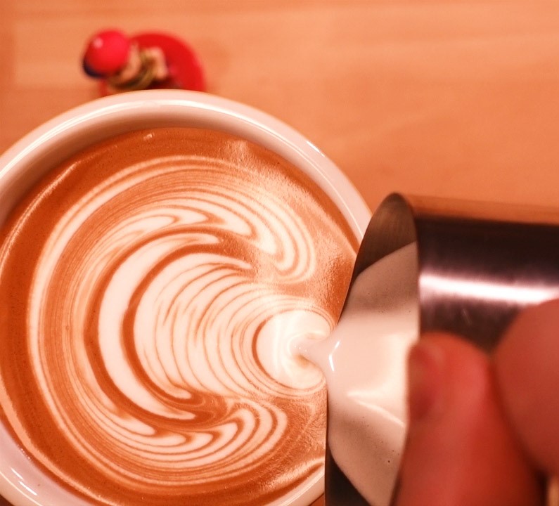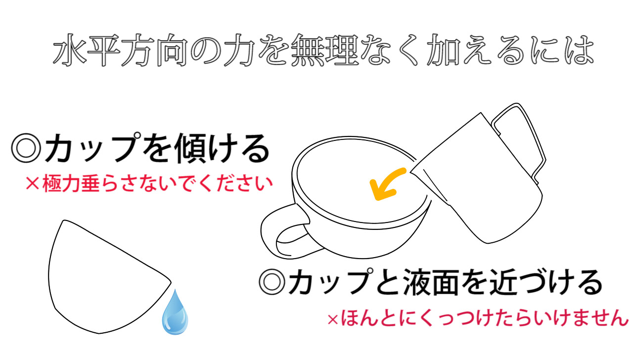 カップ中のクレマ(フォームミルクとエスプレッソの混合した層)を無理なく破っていける水平方向の力が加わっていること
